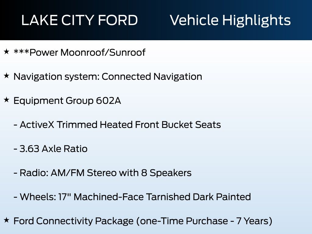 Beneath the bold exterior lies the power of the EcoBoost 2.0L I4 GTDi DOHC Turbocharged VCT engine, paired with an 8-Speed Automatic transmission and All-Wheel Drive. This dynamic powertrain delivers an impressive blend of performance and efficiency, with an EPA-estimated 21 MPG in the city and 27 MPG on the highway.
