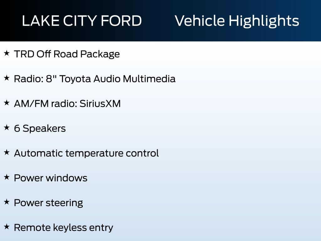 Equipped with a host of advanced features, the Tacoma TRD Off-Road is designed to elevate your driving experience. Enjoy the convenience of Apple CarPlay/Android Auto, the security of a comprehensive safety suite, and the comfort of premium amenities like heated door mirrors and an 8-inch Toyota Audio Multimedia system.